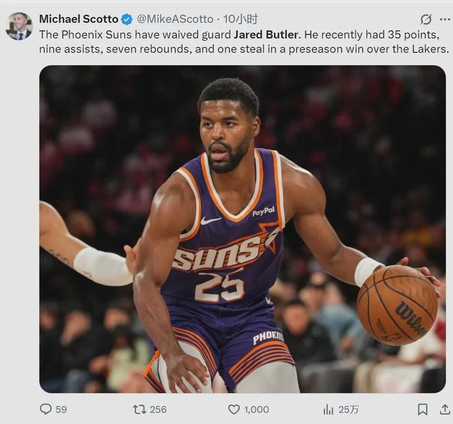 北京时间10月19日,菲尼克斯太阳官方宣布,正式裁掉贾里德-巴特勒,同时给乔丹-古德温一份正式合同。两人都是后卫,也是直接竞争关系,此前都是训练营合同。记者Keith Smith表示,太阳应该同时留下他俩,增加1号位深度。